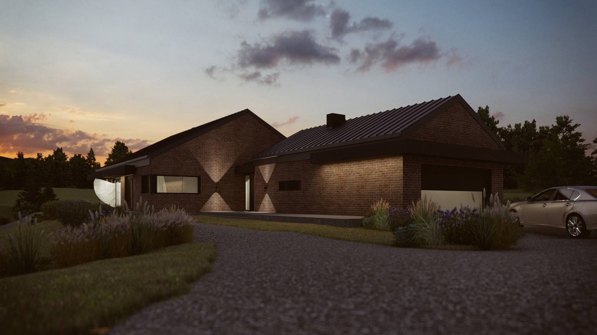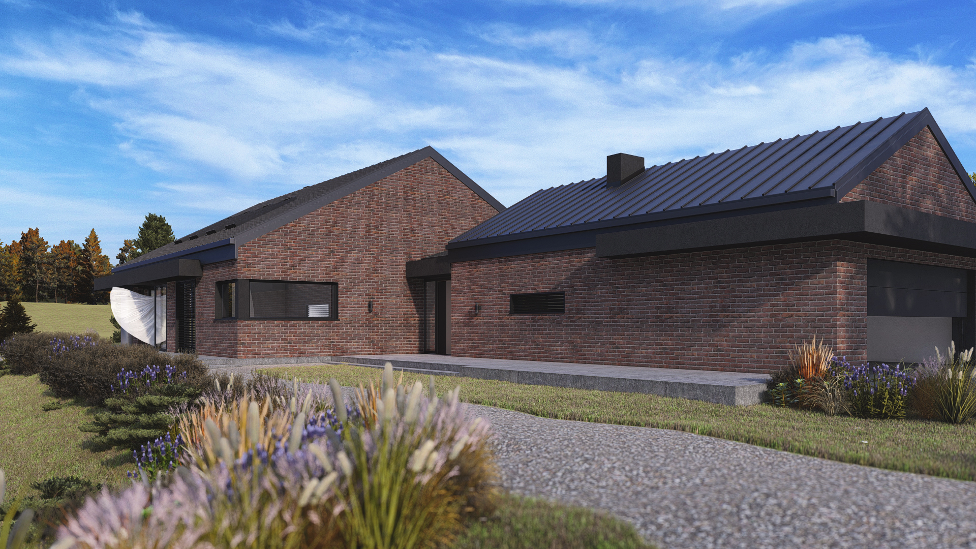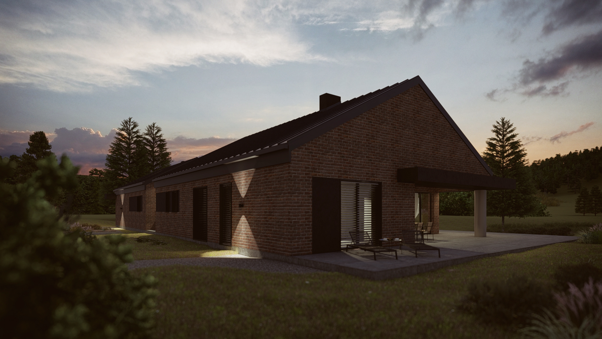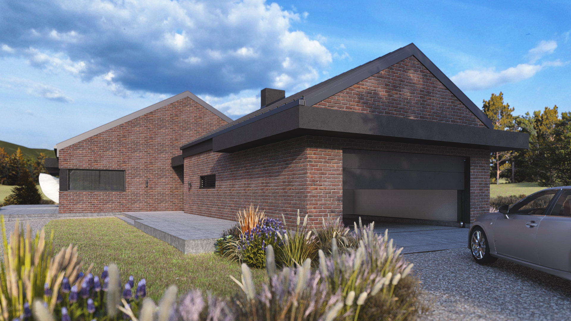 Romulus to projekt przestronnego domu parterowego z wbudowanym garażem, o wyraźnym, współczesnym charakterze. Elewacja z cegły klinkierowej w zestawieniu z dachówką ceramiczną BEAUVOISE nadaje bryle solidność i elegancję. Wysoki salon, okno narożne przy kuchni, kominek i obszerny taras. Ogrzewanie oparte na fotowoltaice i pompie ciepła.