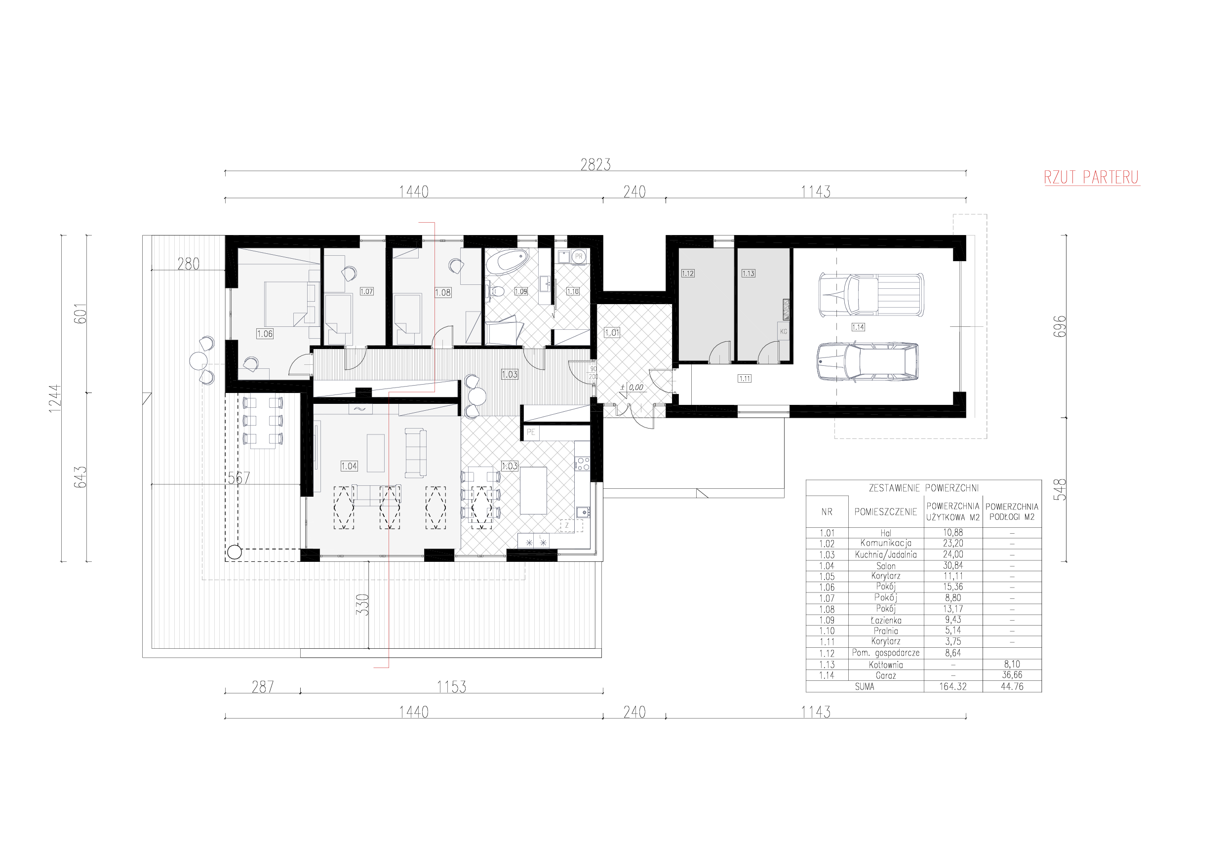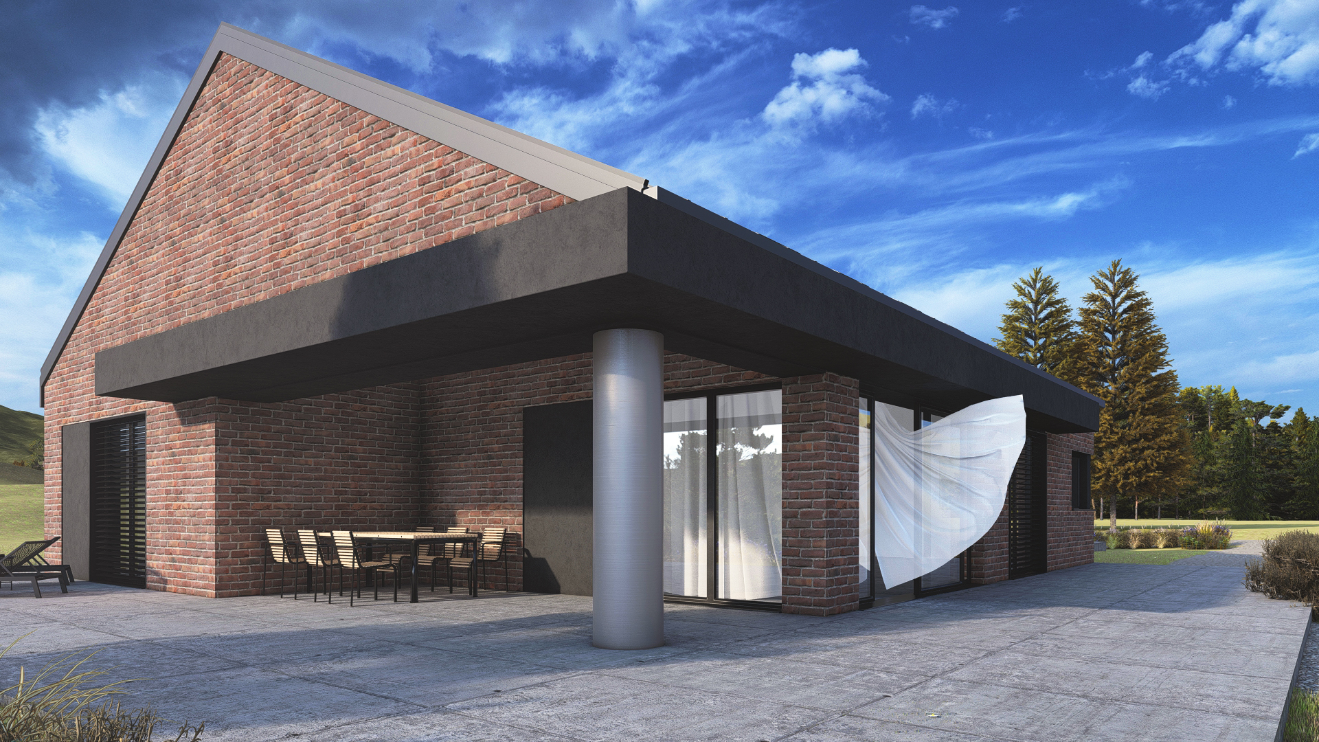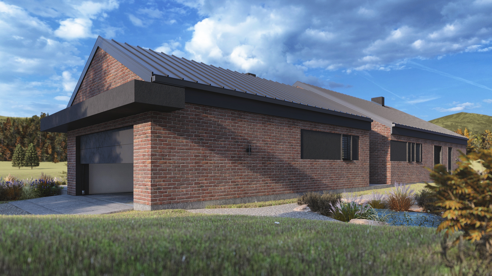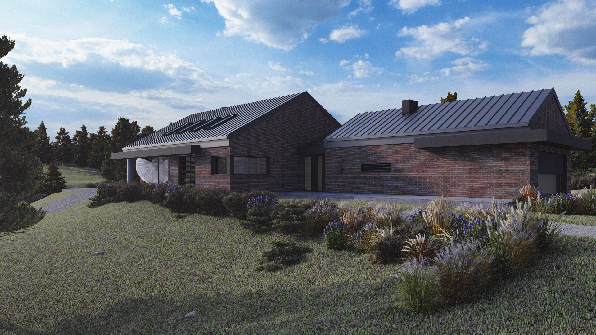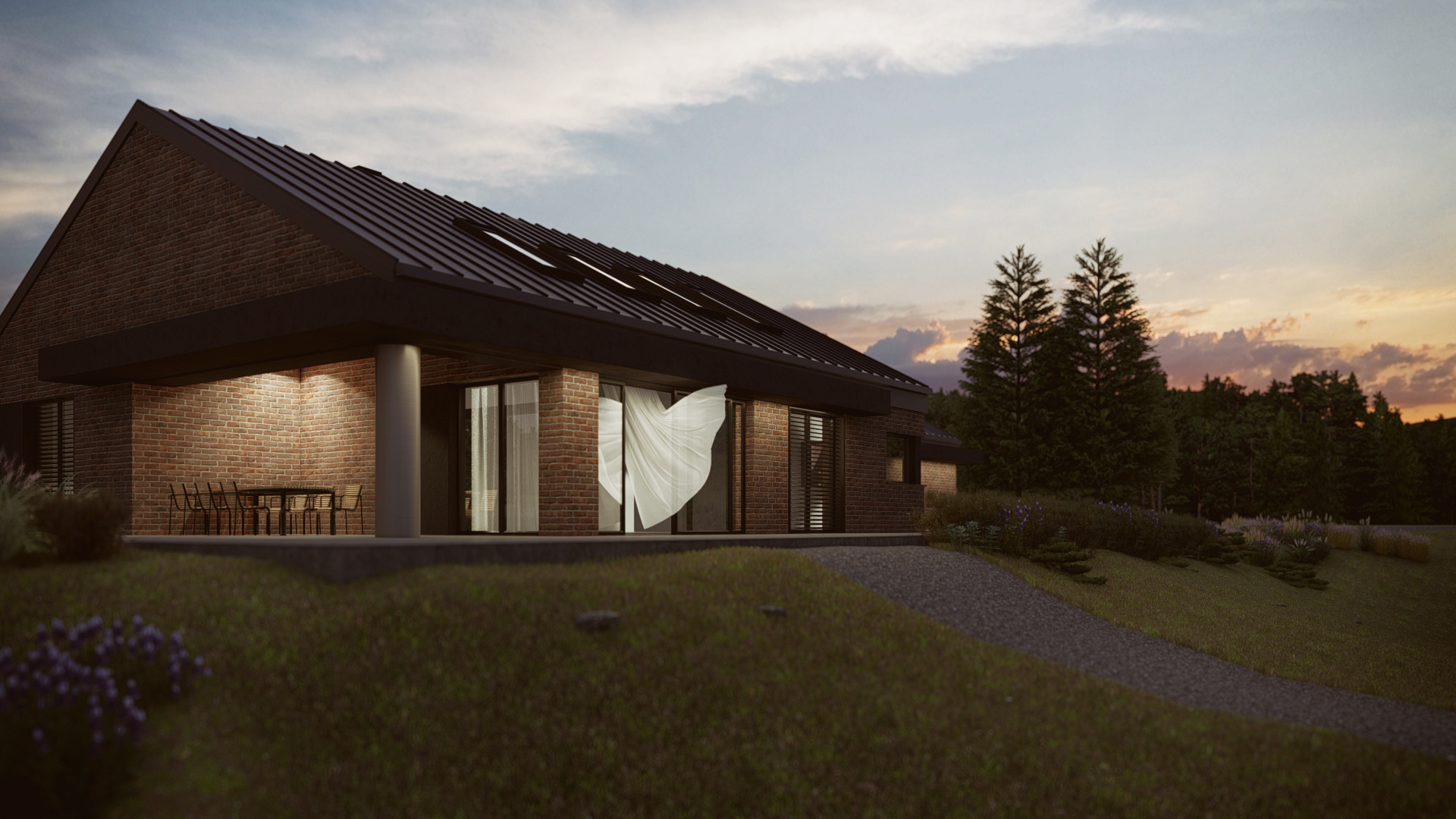 Romulus to projekt przestronnego domu parterowego z wbudowanym garażem, o wyraźnym, współczesnym charakterze. Elewacja z cegły klinkierowej w zestawieniu z dachówką ceramiczną BEAUVOISE nadaje bryle solidność i elegancję. Wysoki salon, okno narożne przy kuchni, kominek i obszerny taras. Ogrzewanie oparte na fotowoltaice i pompie ciepła.