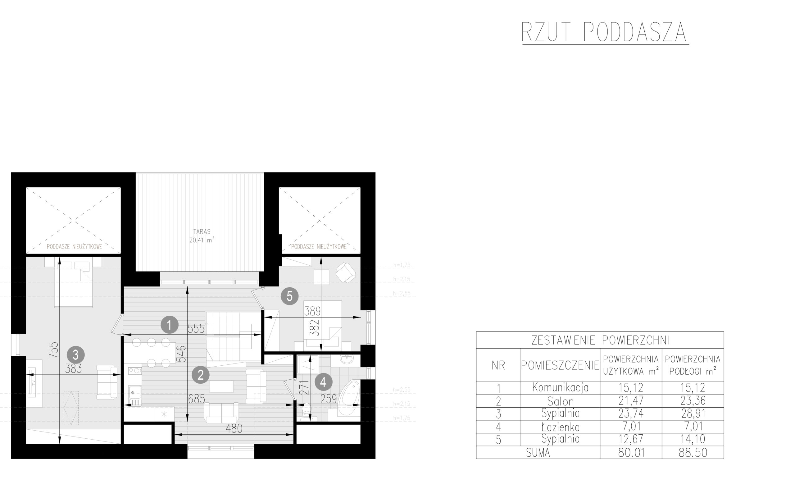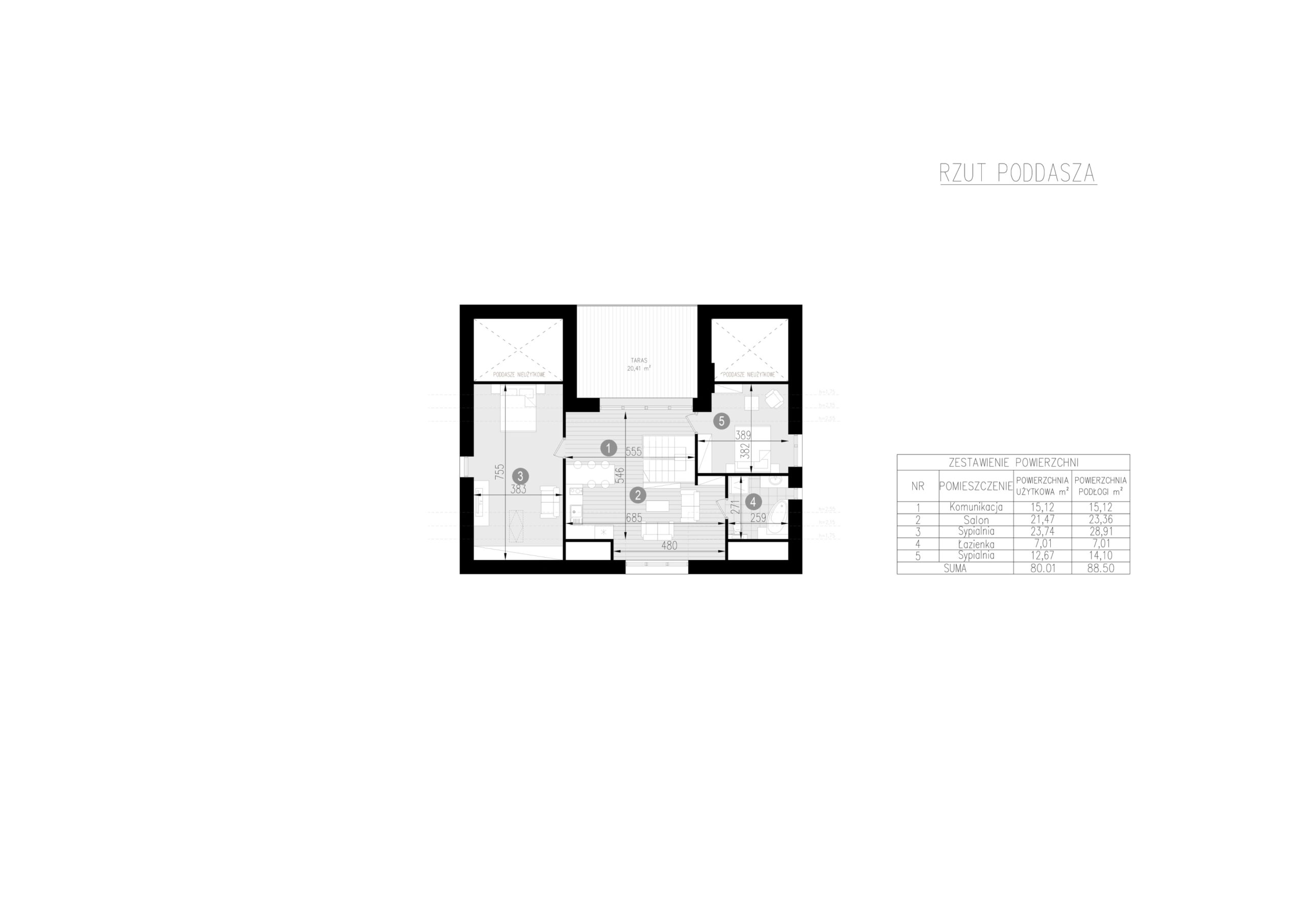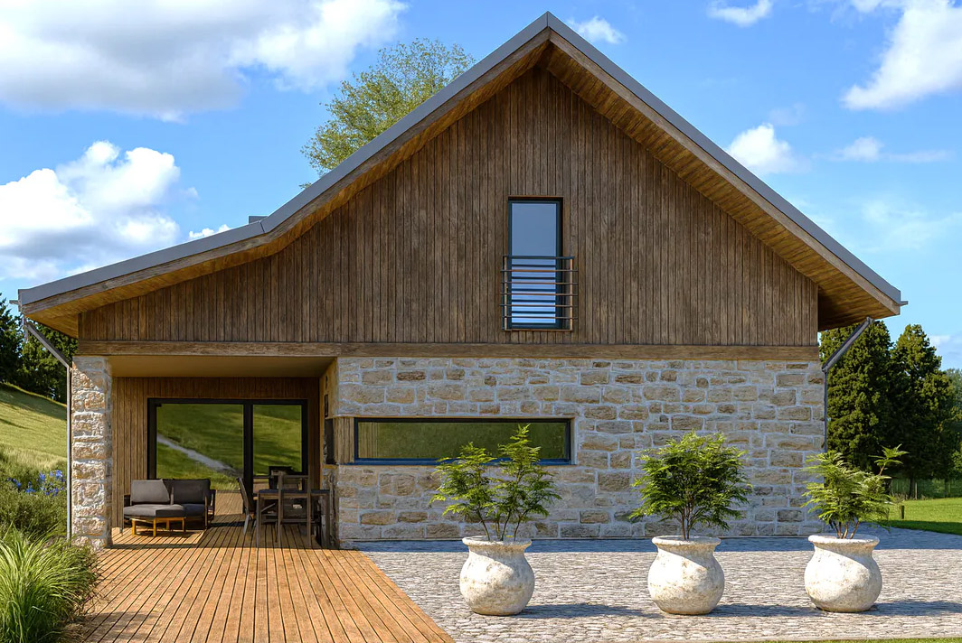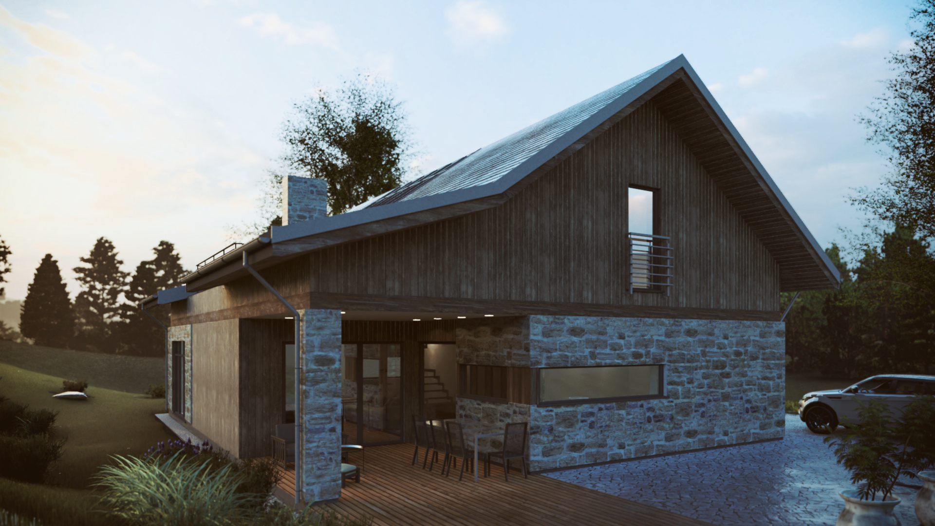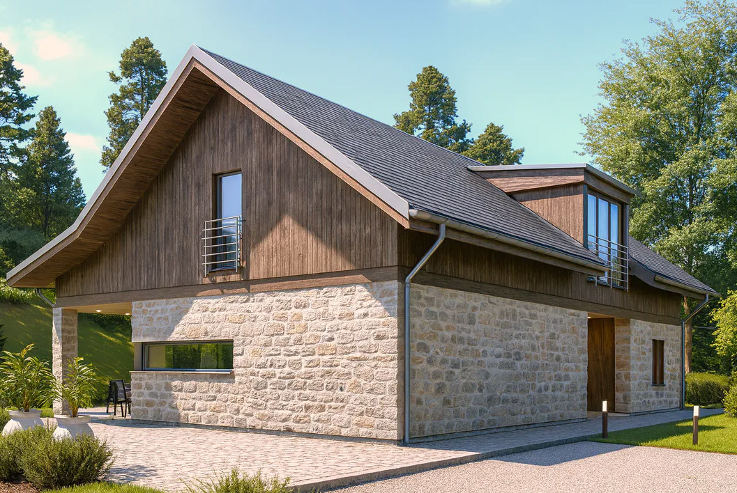 Rufus to dom z charakterem — bezokapowa, czysta bryła o dwuspadowym dachu krytym łupkiem Pizarras, podcień przy wejściu i elewacja z kamienia naturalnego w zestawieniu z deskami opalonymi (Shou Sugi Ban). Parter z otwartym salonem, poddasze z czterema sypialniami. Kominek, taras, okno narożne w kuchni.