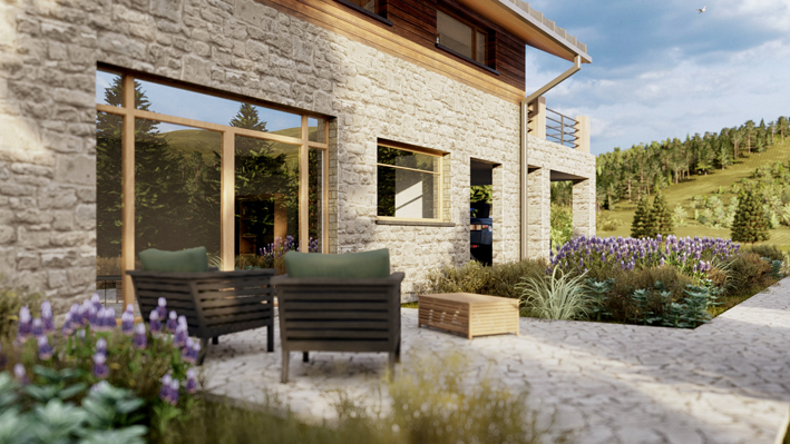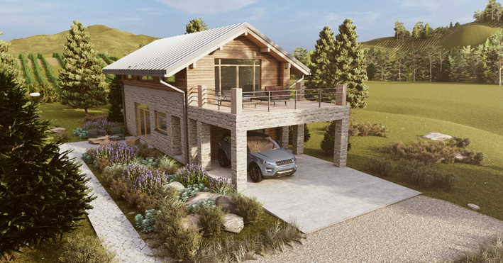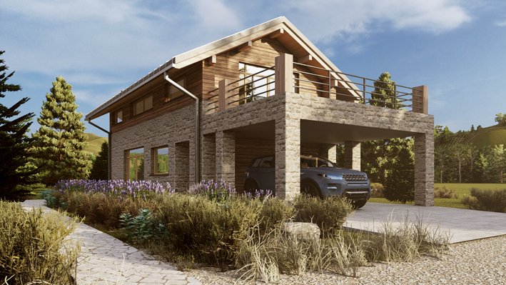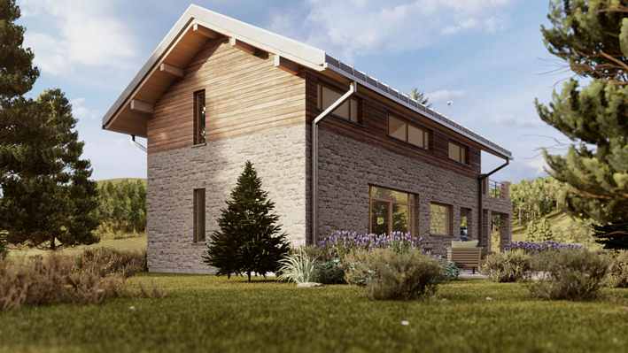 Tytus to projekt domu o wyraźnym górskim charakterze — asymetryczny dach dwuspadowy 29°, elewacja z kamienia naturalnego i desek opalonego drewna (Shou Sugi Ban), antresola, wysoki salon z oknem narożnym. Kominek, taras, panoramiczne przeszklenia. Projekt z certyfikatem DOM + REKREACJA, doskonały jako pensjonat lub dom całoroczny w górach.